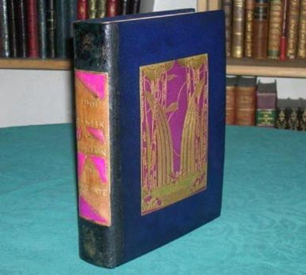 Reliure plein maroquin bleu marine signée René Kieffer. Dos lisse avec grande pièce de titre cuir fauve. Tête doré. Décor à froid, doré et violine sur les plats. Débordement de maroquin sur les contreplats avec double filet doré et petits décors angulaires. Couverture illustrée et dos conservés. Étui avec liseré. Mors et dos restaurés. Bon état. Format in-4°(25×20).