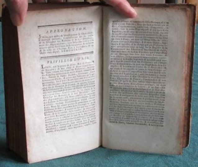 Reliure plein veau marbré de l’époque. Dos à nerfs orné et doré. Pièce de titre maroquin rouge. Titre en rouge et noir. Tranches rouges. Tampons. Léger accident à la coiffe supérieure. Coins émoussés. Pas de rousseur. Intérieur frais. Bon état. Format in-12°(17×10).