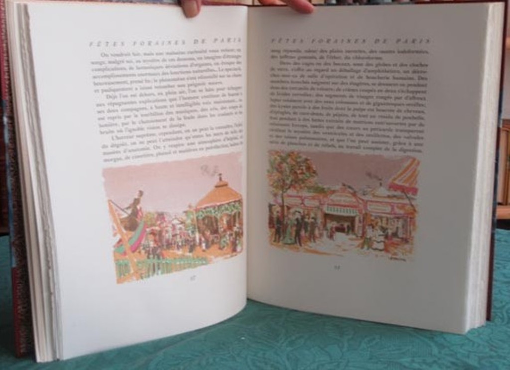 Reliure demi maroquin framboise à coins, signée Manuel Gérard. Dos lisse aux titre et auteur dorés, orné d’un semis d’étoiles dorées. Filet doré bordant les plats. Tête dorée sur témoins, non rogné. Couverture et dos illustrés par l’artiste, conservés. Étui à liseré. Très bon état. Format in-4°(33×26).