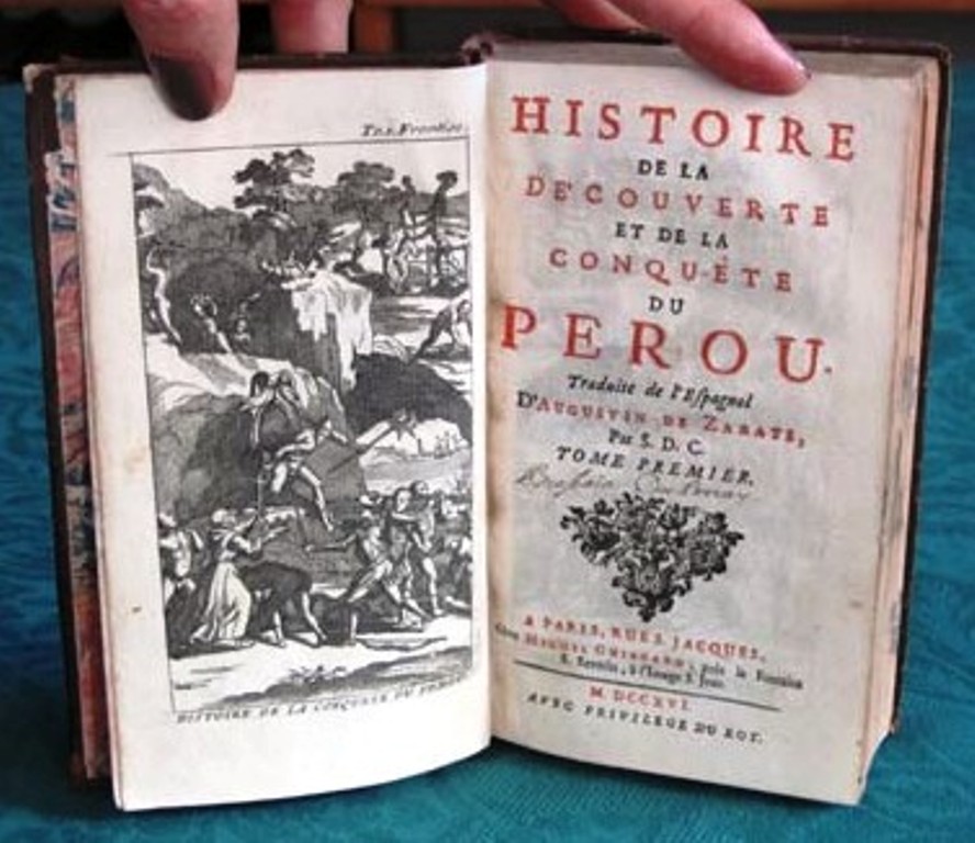 Traduite de l’espagnol d’Augustin de Zarate par S.D.C. 13 gravures dont 2 dépliantes + 1 carte repliée et 1 frontispice. Titre imprimé en rouge et noir. Bandeaux, lettrines et culs-de-lampe gravés.