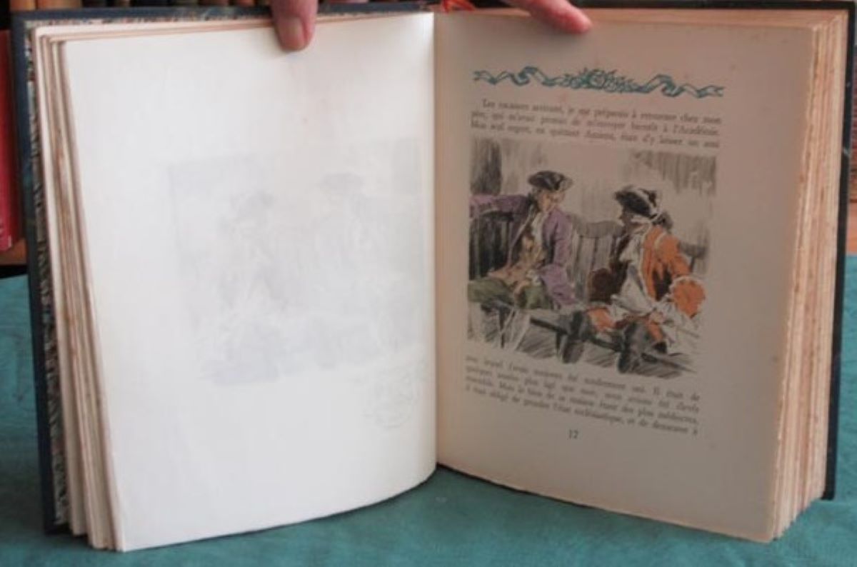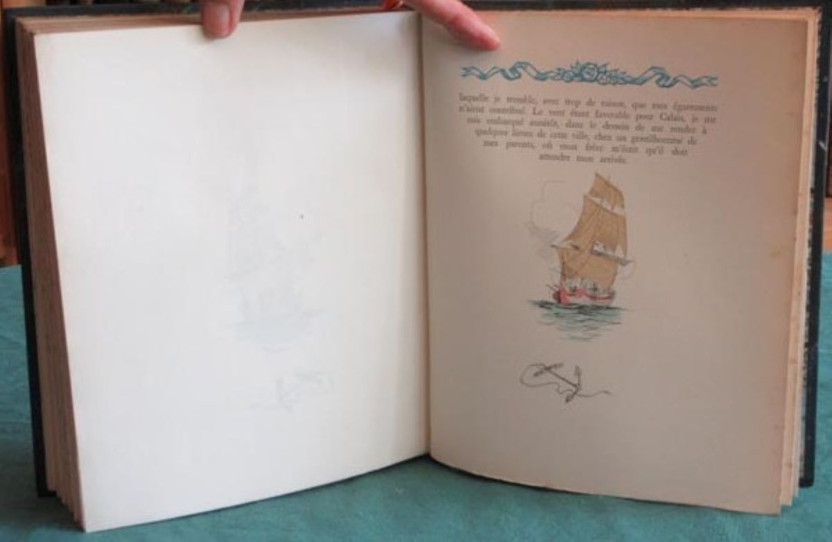 Reliure demi maroquin bleu à coins, signée de Yseux Sr. de Simier. Dos lisse orné d’une décor romantique doré. Tête dorée sur témoins, non rogné. Suites insérées. Signet. Couverture illustrée, et dos conservés. Quelques rousseurs principalement dans les marges et sur les pages de gardes. Dos insolé. Bon état. Format in-8°(24×19).