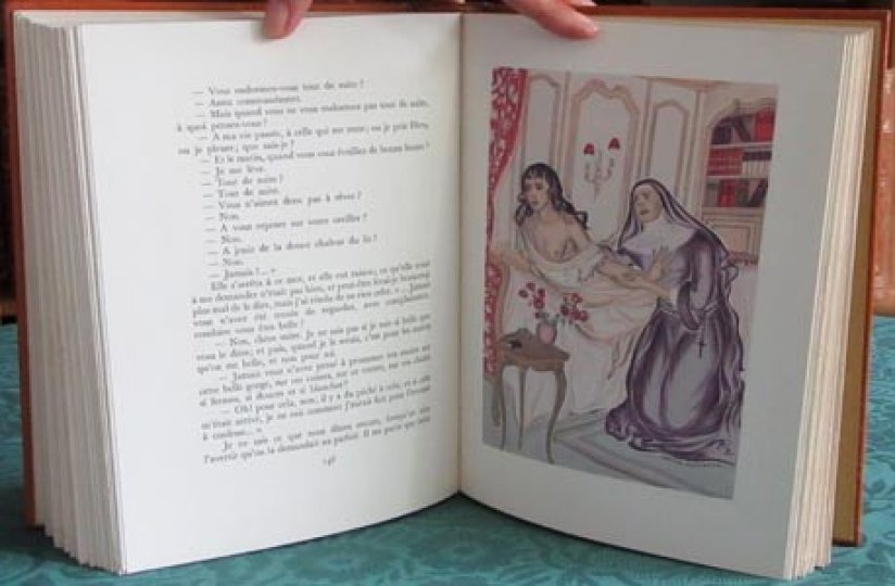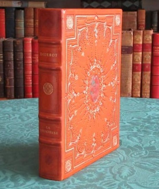 Reliure plein cuir havane de l’éditeur, pastiche d’une reliure 18e. Dos à nerfs orné à froid et fleuron doré. Plats richement ornés et dorés. Tête dorée. Cabochon au centre du plat supérieur manquant. Gardes de soie moirée. Étui à liseré. Pas de rousseur. Très bon état. Format in-4°(25×20).