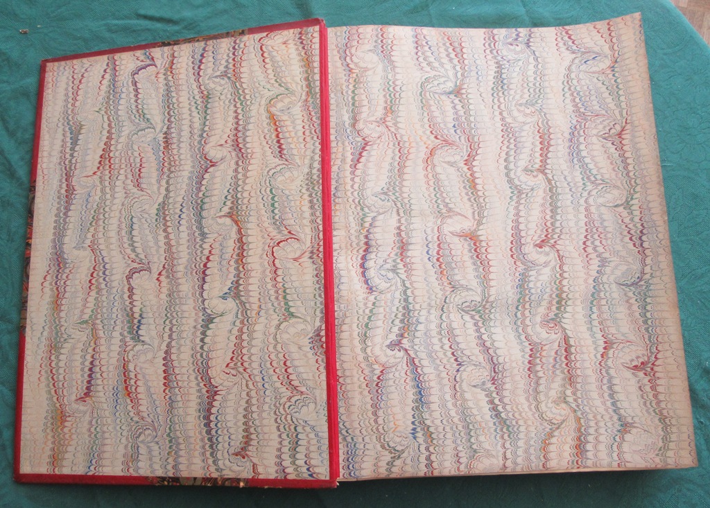 Reliure demi-maroquin rouge à coins de l’époque. Dos à nerfs avec titre et tomaison. Coiffes et nerfs légèrement frottés. Têtes dorées. Pas de rousseur. Très bon état. Forts volumes. Format in-folio (53×41).
