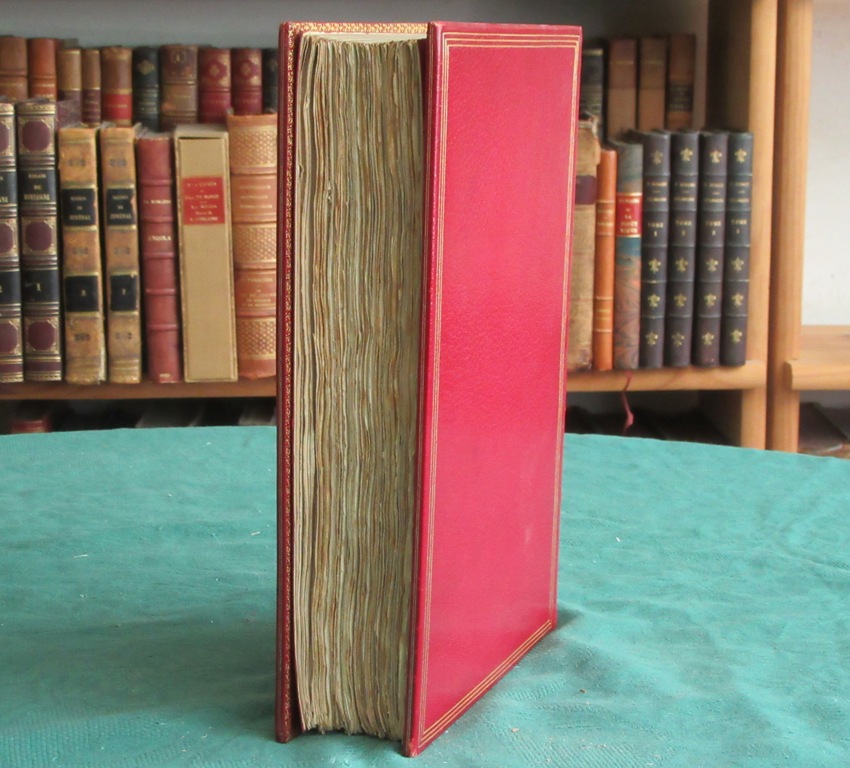 Splendide reliure anglaise plein maroquin rouge signée Zaehnsdorf (1912). Dos à nerfs orné de caissons, auteur, titre et date en pied, dorés. Triple filet doré encadrant les plats. Double filet sur les chasses et les coupes. Large dentelle intérieure. Gardes de soie rouge moirée. Signet. Couverture conservée. Rares rousseurs. 1 petit accroc à la soie d’une garde. Très bon état. Format in-4°(26×18).