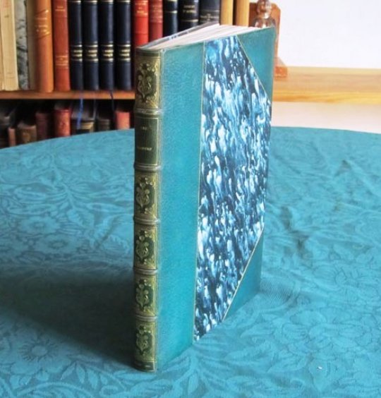 Belle reliure demi-maroquin vert à coins signée Raparlier. Filet doré bordant les plats. Dos à nerfs doré et fleuronné. Tête dorée sur témoins, non rogné. Couverture conservée illustrée d’une vignette. Pas de rousseur. Très bon état. Format in-4°(25×17).