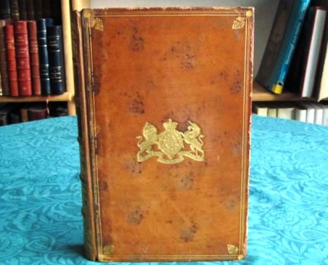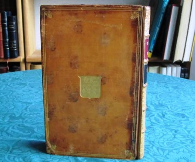 Belle reliure plein veau glacé de l’époque. Dos à nerfs orné et doré avec pièces de titre rouge et de tomaison noire. Tranches marbrées. Armes dorées sur les plats des 3 volumes. Triple filets dorés encadrant les plats avec fleurons angulaires. Roulettes dorées sur les coupes et bordant les contreplats. Très rares rousseurs. Très bon état pour cet exemplaire précieux. Format in-4°(28×18).