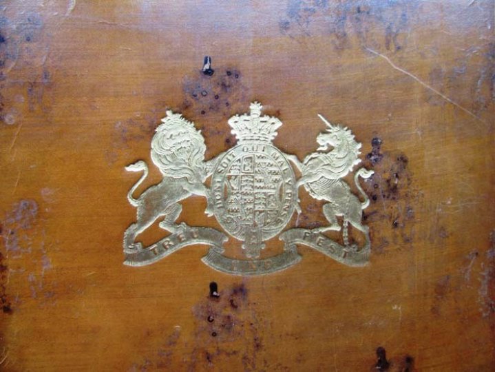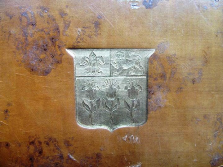 Armes indéterminées. Plat supérieur, un lion et une licorne de chaque coté d’une couronne posée sur une sphère portant l’inscription « Honi soit qui mal y pense ». Plat inférieur, blason représentant une fleur de lys, un lion et trois tulipes.