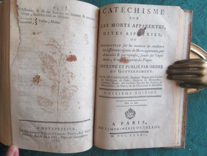 9° Catéchisme sur les morts apparentes, dites asphyxies. Par M. De Gardanne. 8e édition. A Paris, Valade – 1782 – 116 pages.