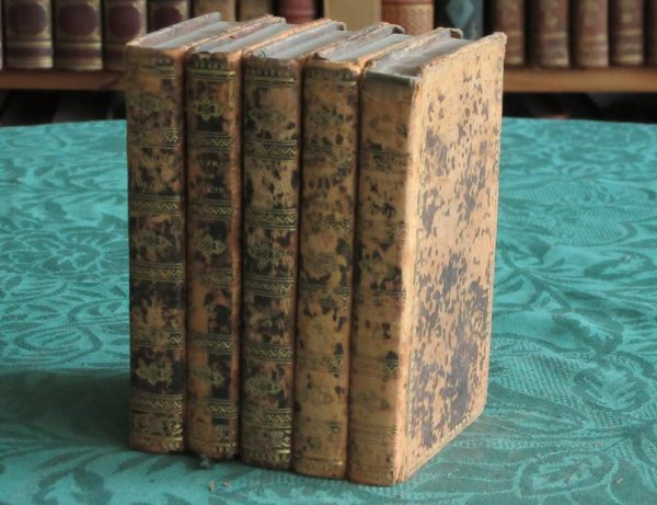 Reliure plein veau de l’époque. Dos lisse ornés, avec titre et tomaison. Dentelle dorée encadrant les plats. Dos et plats frottés. Coiffe sup. du T5 accidentée. Quelques rousseurs éparses. Bon état. Format in-16°(14×9).