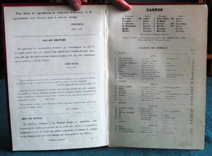 Opéra en quatre Actes tiré de la Nouvelle de Prosper Mérimée. Poème de H. Meilhac et L. Halévy. Musique de Georges Bizet. Partition Chant et Piano arrangée par l’Auteur. Mise en scène de Charles Ponchard (1824-1891).