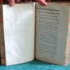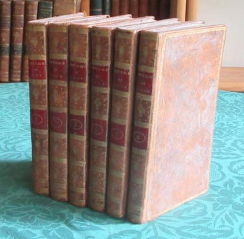 Reliure plein-veau raciné de l’époque. Dos lisse orné et doré, pièces de titre et de tomaison maroquin rouge. Tranches marbrées en couleurs. Roulette dorée encadrant les plats et ornant les coupes. Petits accidents aux coiffes inférieures. Galeries de vers aux plats des tomes 3, 4 et 5. Pas de rousseur. Intérieurs frais. Bon état. Format in-8°(20×13).